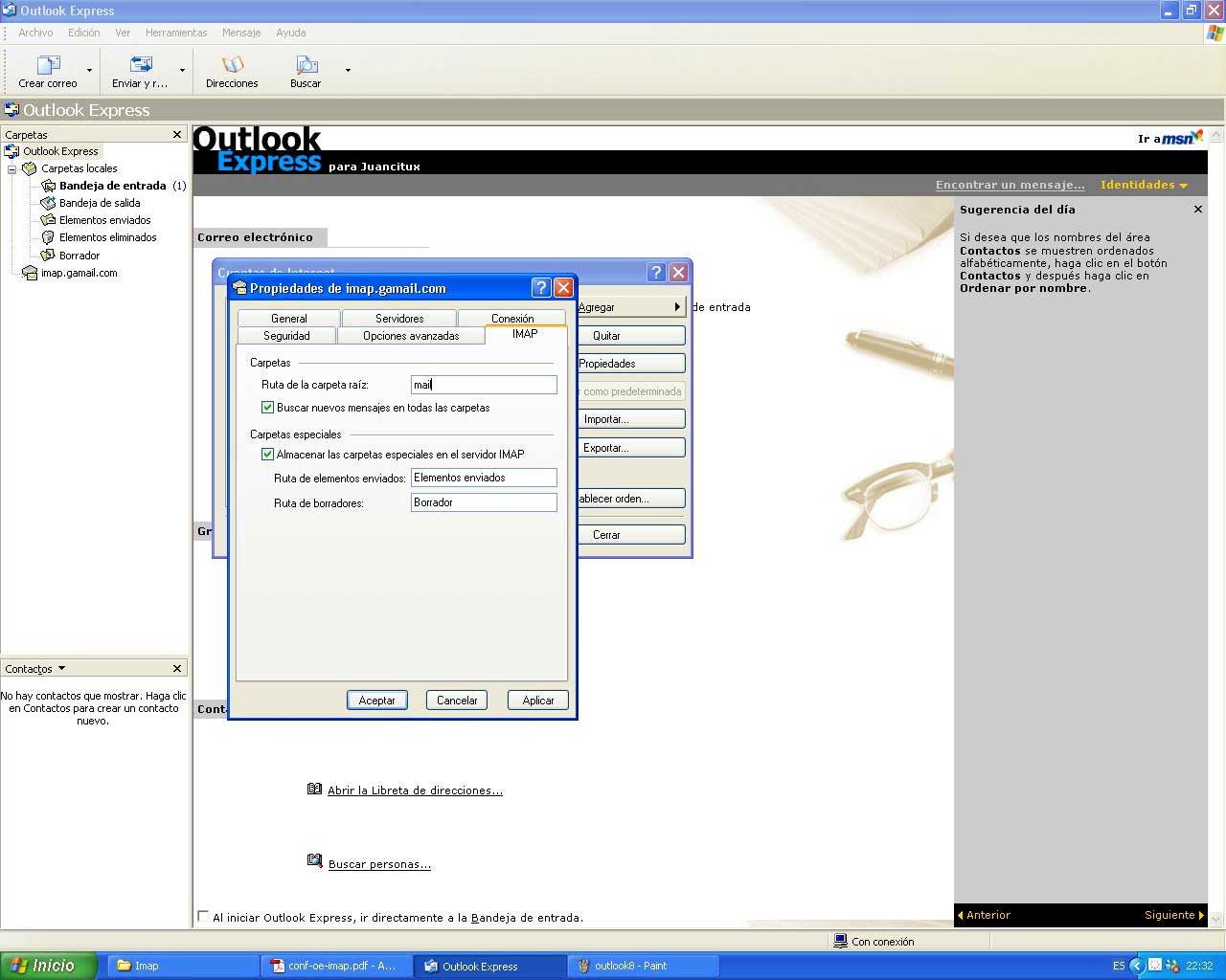 Como ya dije antes, la configuración va por parte del cliente (en este caso que estamos estudiando), por lo tanto, esta varía. Applemail, Outlook, thunderbird tienen distintas ventanas gráficas al configurar, sin embargo, los parámetros de IMAP deben ser los mismos: