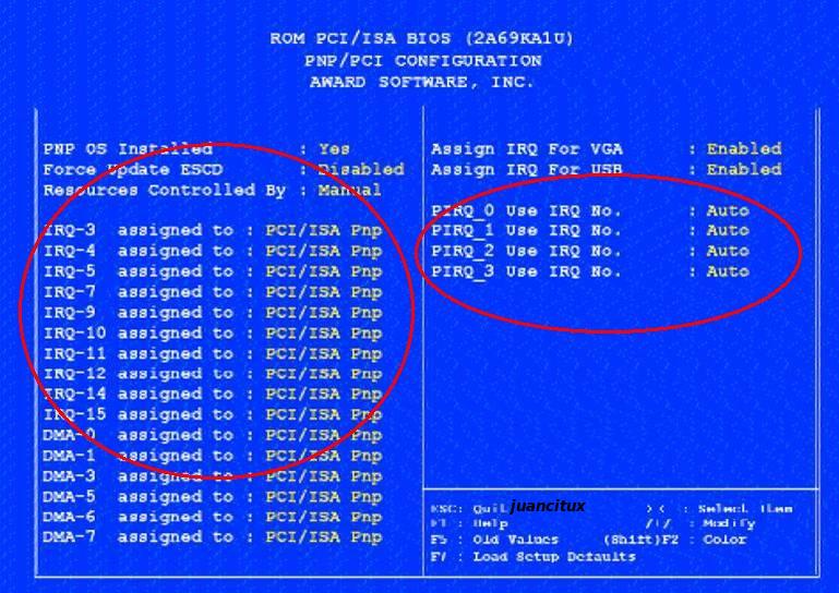 Algunas imágenes de BIOS para que veas como cambiar las asignaciones de IRQ, acordate que no podés asignar el mismo IRQ a dos dispositivos porque entrarías en conflicto: