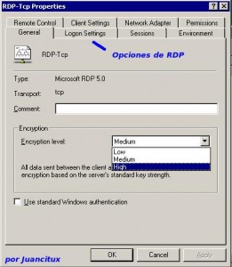 Basicamente el proceso consiste en meter en formato RDP la información generada por el equipo que juega el papel de servidor y mostrarla al equipo que juega el papel de cliente. Digo “equipos que juegan papel” porque no hace falta un servidor de por medio, al usar dos XP por ejemplo, en el que juegue el papel de server se pondra la pantalla de “Bienvenida” cuando el otro equipo tome control del Escritorio. No voy a meterme en la explicación de cuál es la diferencia con terminal server, aquel que tenga dudas, sólo tiene que buscar dentro de este sitio dónde hay material muy interesante y completo al respecto.