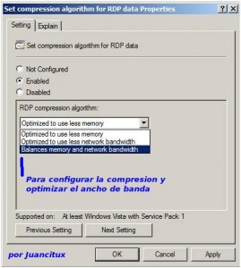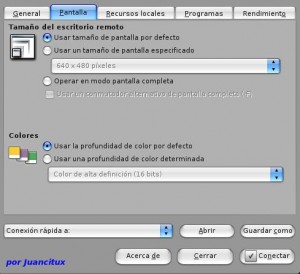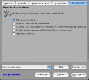 Dentro de las configuraciones podemos modificar está: el uso de colores, usar el audio, compartir el portapapeles y varias utilidades Drag and Drop (arrastrar desde el escritorio “Cliente” al escritorio “Servidor”),la suavidad de las letras, los efectos de escritorio, la compresión a nuestro gusto, logrando así una optimización del ancho de banda.